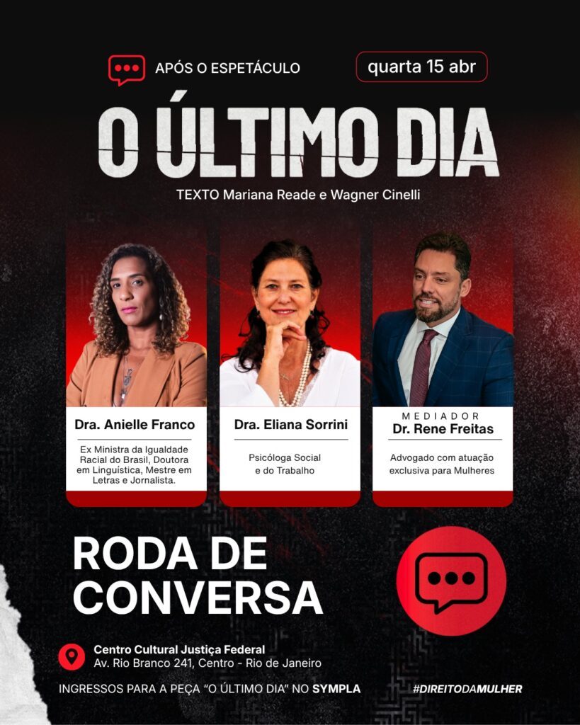 Eliana Sorrini, Psicóloga Social e do Trabalho e Consultora Estratégica em Saúde Mental, participa de debate com atores e plateia, ao final do espetáculo O ÚLTIMO DIA, no Centro Cultural Justiça Federal, no próximo dia 15 de abril (quarta), com participação especial de Anielle Franco, ex-Ministra da Igualdade Racial.