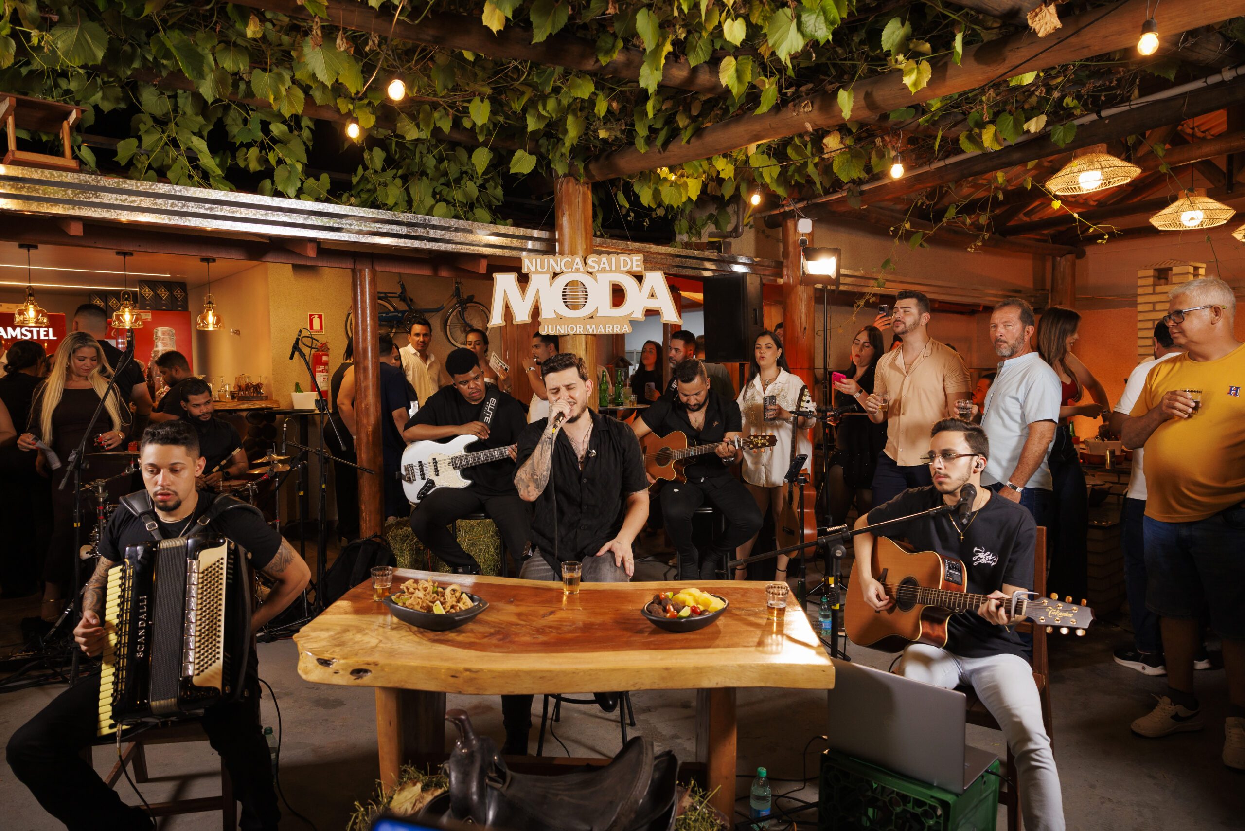 Na última quarta-feira (12), o cantor Júnior Marra transformou o Galo Vei Quintal Caipira, em Goiânia, num palco de resenha e clima de nostalgia. O novo projeto audiovisual “Nunca Sai De Moda” foi gravado de forma intimista, com ares de encontro entre amigos sentados à mesa de bar, e contou com participações especiais de Gabriel Gava, Wesley e Conrado, Kleo Dibah, Jeff Moraes e Renan e Ray.