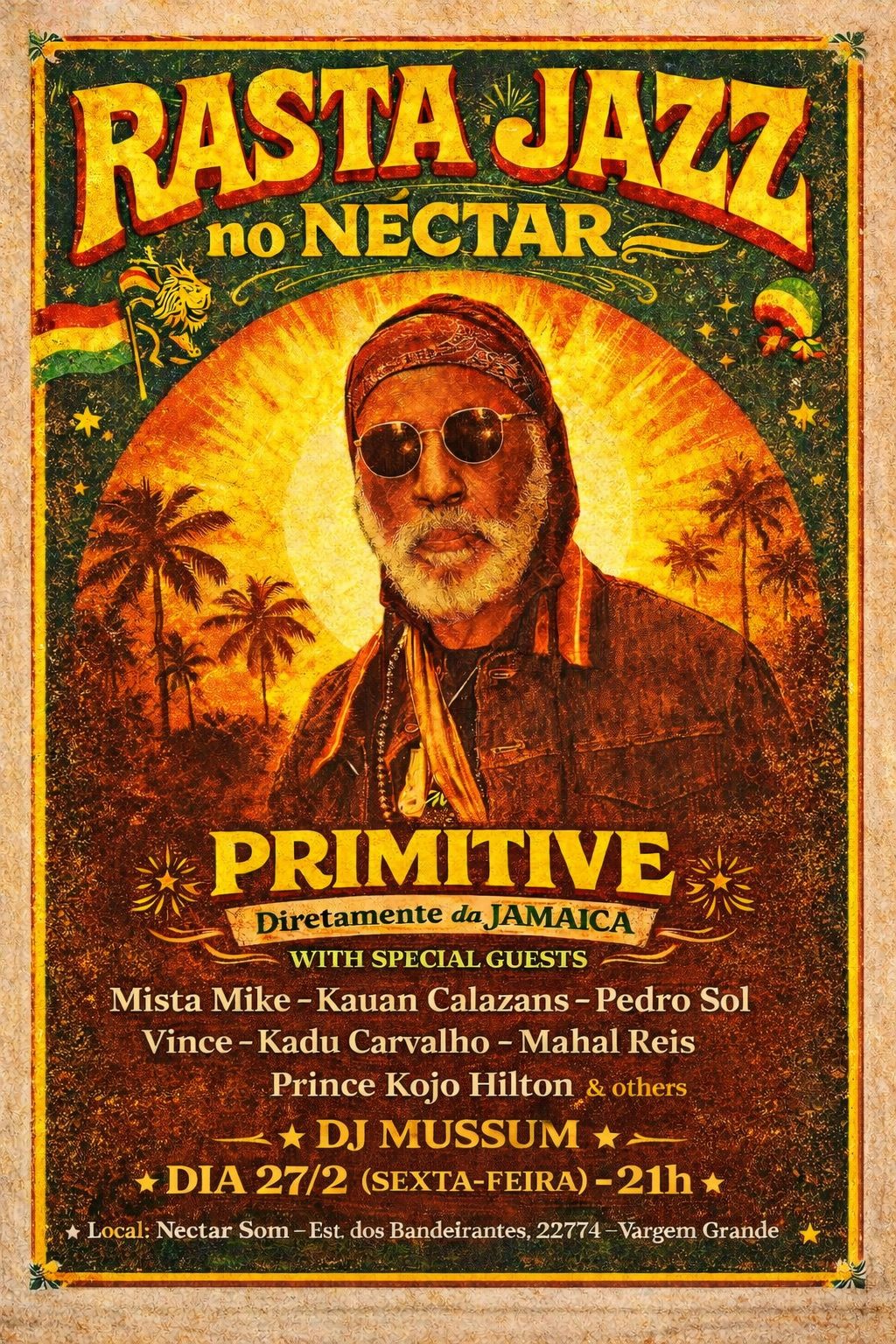 RASTA JAZZ no NECTAR é uma celebração única da cultura roots e do espírito do reggae clássico, trazendo à cena carioca um dos nomes mais respeitados do universo jamaicano: PRIMITIVE — conhecido por sua presença autêntica nas rodas de reggae e por carregar a tradição da música jamaicana com o mesmo pulso que marcou o movimento roots desde os anos 1970.