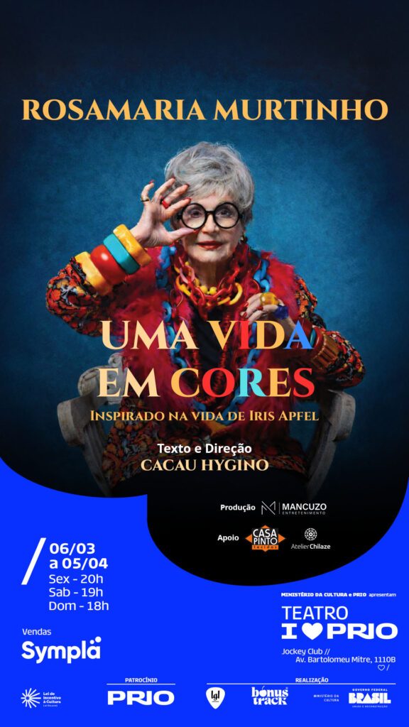 A atriz Rosamaria Murtinho retorna ao teatro aos 93 anos interpretando a icônica designer e empresária americana Iris Apfel no espetáculo “Uma Vida em Cores”, com texto e direção de Cacau Hygino. A montagem estreia no Teatro I Love PRIO, no Jockey Club, e marca uma nova fase de um projeto que nasceu há mais de nove anos e que agora ganha uma releitura mais íntima e geracional. A temporada vai de 06 de março a 05 de abril, com sessões sextas, às 20h, sábados, às 19h, e domingos, às 18h.