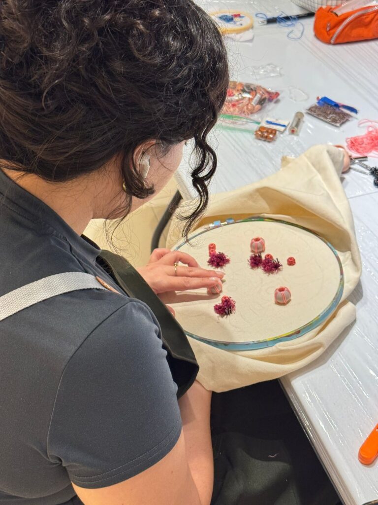 Sua prática artística emerge de uma vida de contrastes: o científico e o sensorial, o orgânico e o inorgânico, o minúsculo e o expansivo. Por meio do que ela chama de “tradução de cores”, ela captura a energia intangível de emoções, lugares e momentos, transformando-os em composições abstratas que se situam entre o orgânico e o poético. Suas peças, criadas em aquarela e enriquecidas com bordados e intervenções, evocam formas orgânicas, como se o papel fosse um campo onde as emoções crescem, se multiplicam e se transformam. O fio atua como uma extremidade, conectando o científico com o artesanal, o efêmero com o permanente.