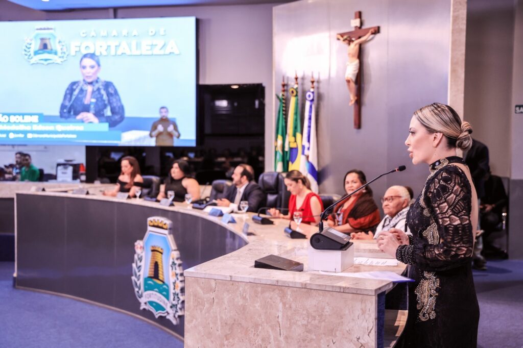 A solenidade também chamou atenção pela composição de sua mesa de honra, majoritariamente feminina, uma configuração rara nas homenagens da Câmara Municipal de Fortaleza. Presidida pelo vereador Wellington Sabóia, a mesa reuniu mulheres em posições de destaque, reforçando o simbolismo da noite e a quebra de padrões históricos no espaço político e institucional da cidade.
