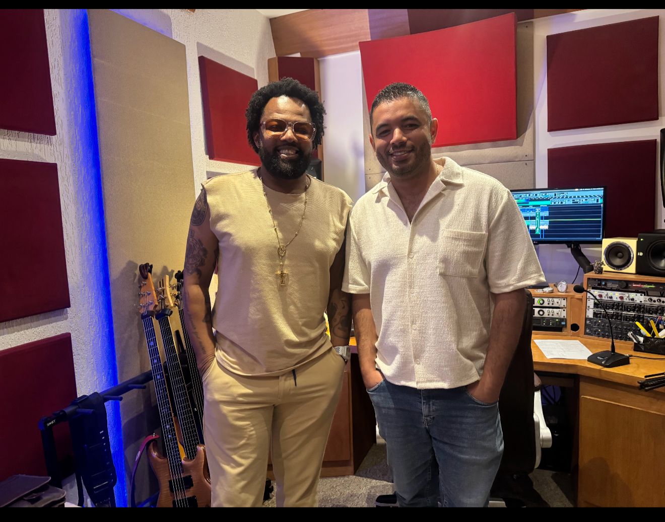 Xande de Pilares e Felipe Reis posam no estúdio, depois de gravarem a canção inédita “Eram dois ou mais”, de Paulo César Feital e Cláudio Azeredo.